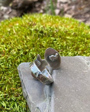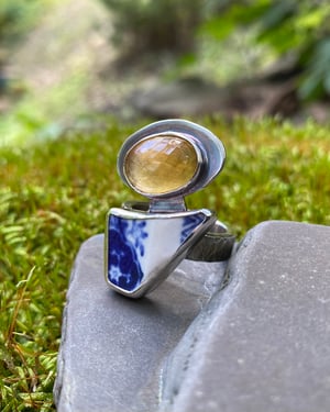 Built with a gorgeous, faceted citrine and a piece of Seneca Lake tumbled fine china transferware. Set in fine and sterling silver with a thick hand hammered sterling band. A patina has been added for warmth and to bring out details.