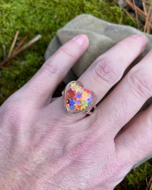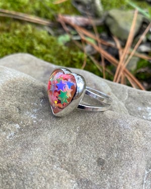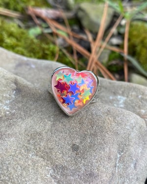Sparkles upon sparkles is what this ring is all about! This ring is built from a large resin heart that is JAM PACKED with sparkly, iridescent stars, set in fine silver and features a double square wire sterling silver band. SO DREAMY!