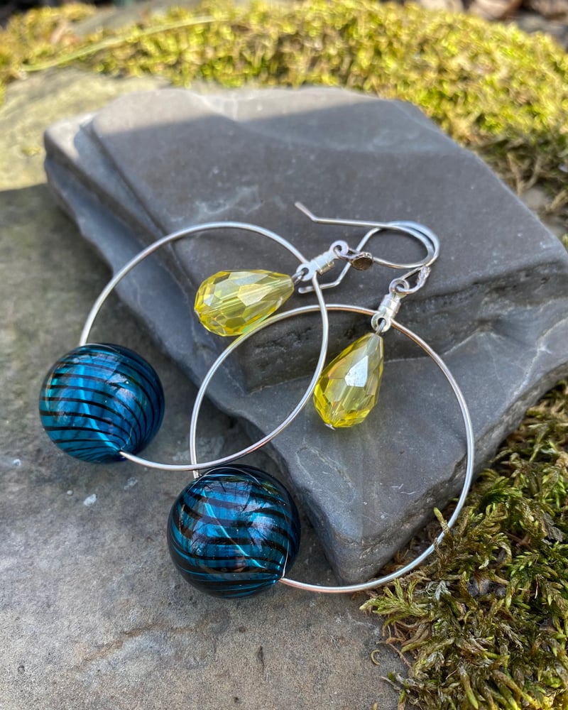 This pair of earrings features the coolest hollow blown glass globe beads paired with a gorgeous drop crystal. They hang on my signature and forged sterling silver earwires.